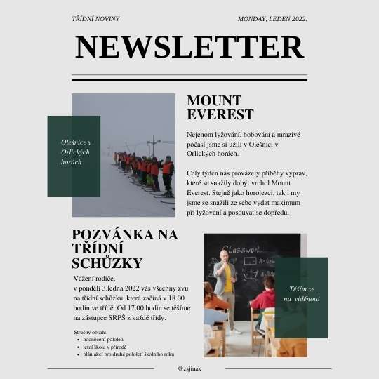 Zkuste rodiče informovat trochu jinak. Co takhle vyzkoušet NEWSLETTER? Určitě Vás i rodiče překvapí příjemná změna. Nechte na něm pracovat děti v hodinách dílen psaní a jednou za čtvrt roku rozešlete „noviny“.